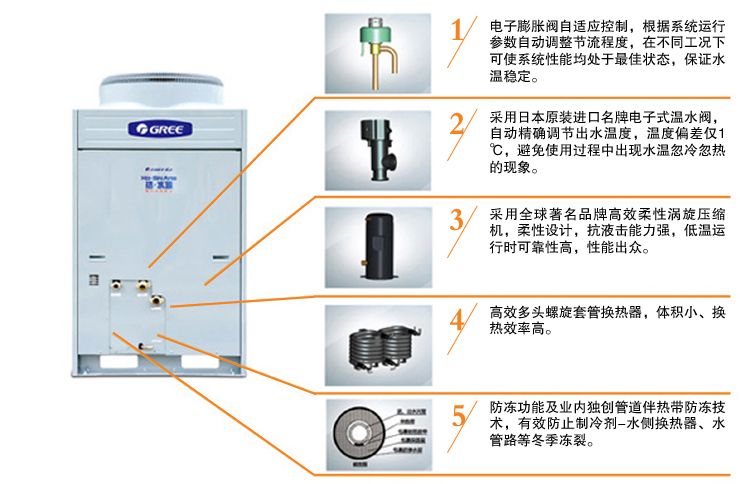 1、采用先進的水路設(shè)計,平均能效比高達4.5(高達5.8)。